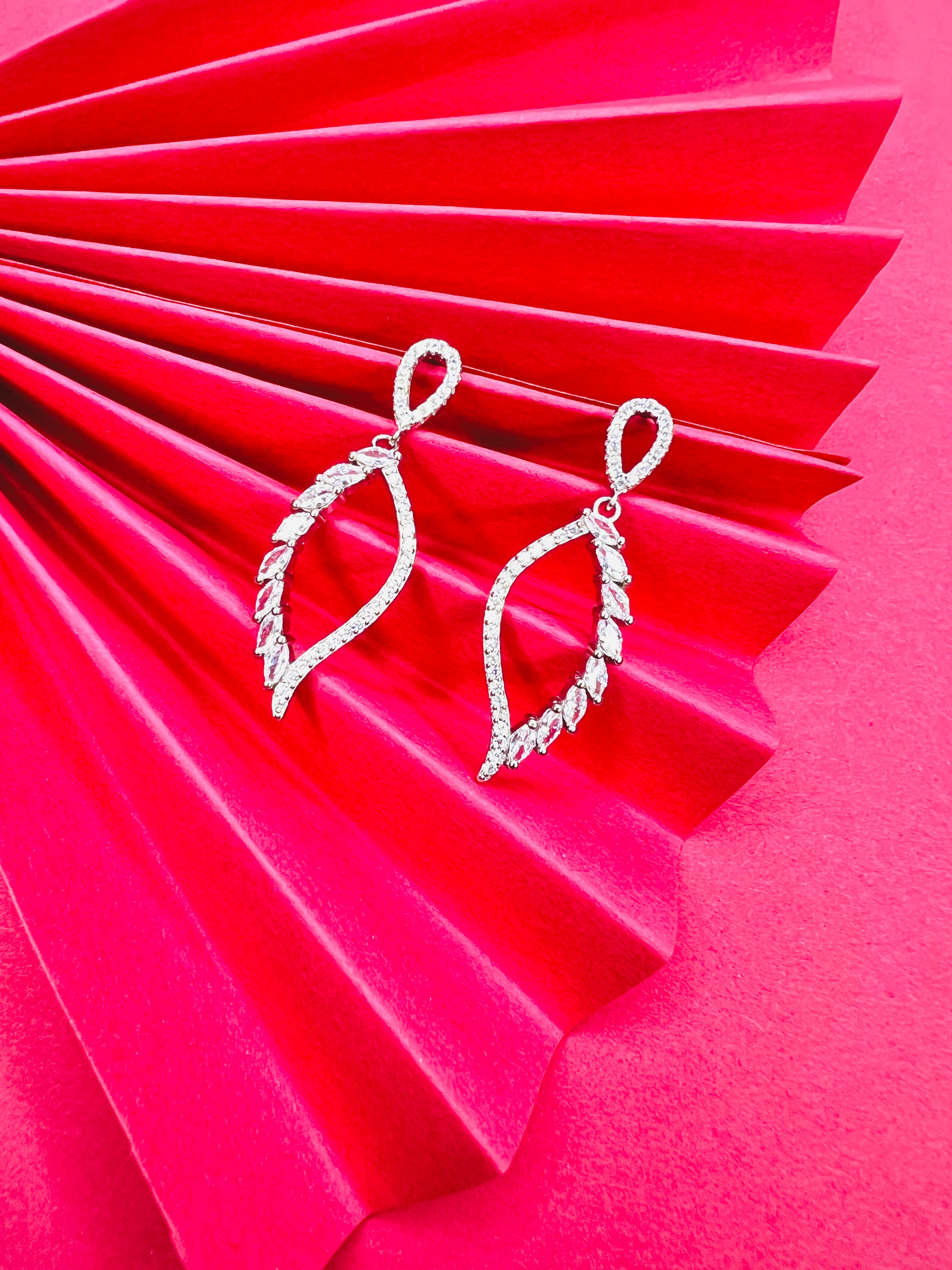 Delicate yet dazzling, these vine-inspired drop earrings are a symphony of sparkle and sophistication. Crafted with a graceful leaf-like curve, they feature a trail of marquise-cut stones set in a sleek, openwork design. The looped top adds a graceful drop effect, making them perfect for formal soirées, weddings, or festive evenings. Lightweight, elegant, and eye-catching — they’re made to elevate your every occasion with a touch of glamour.
