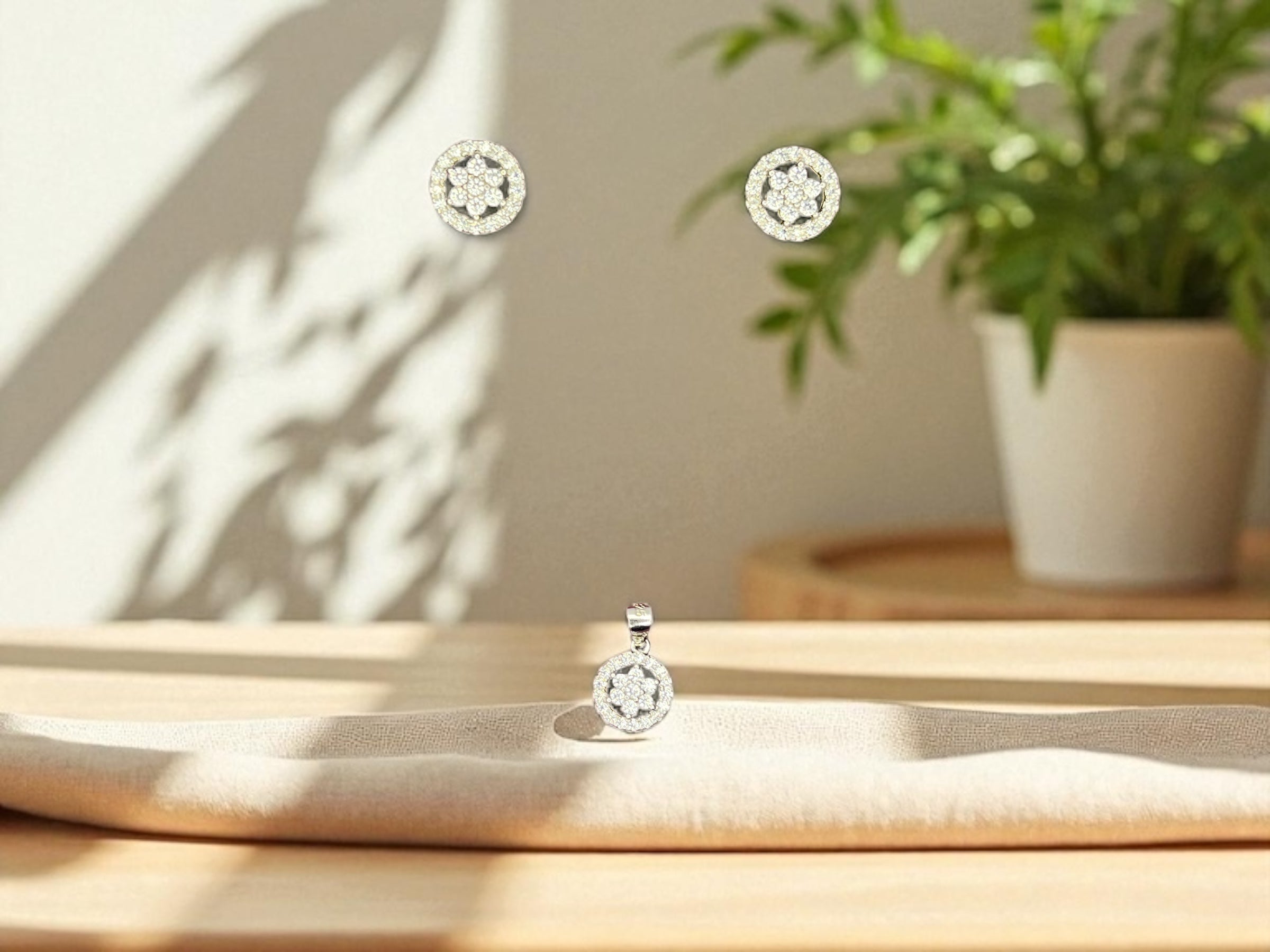 Embodying grace and charm, the Floral Halo Set features a round pendant and matching earrings with a blooming floral motif encircled by a brilliant diamond halo. The soft natural lighting and leafy shadows enhance its delicate sparkle, making it a perfect expression of feminine elegance. Ideal for day-to-evening wear, this set brings timeless beauty to any occasion.